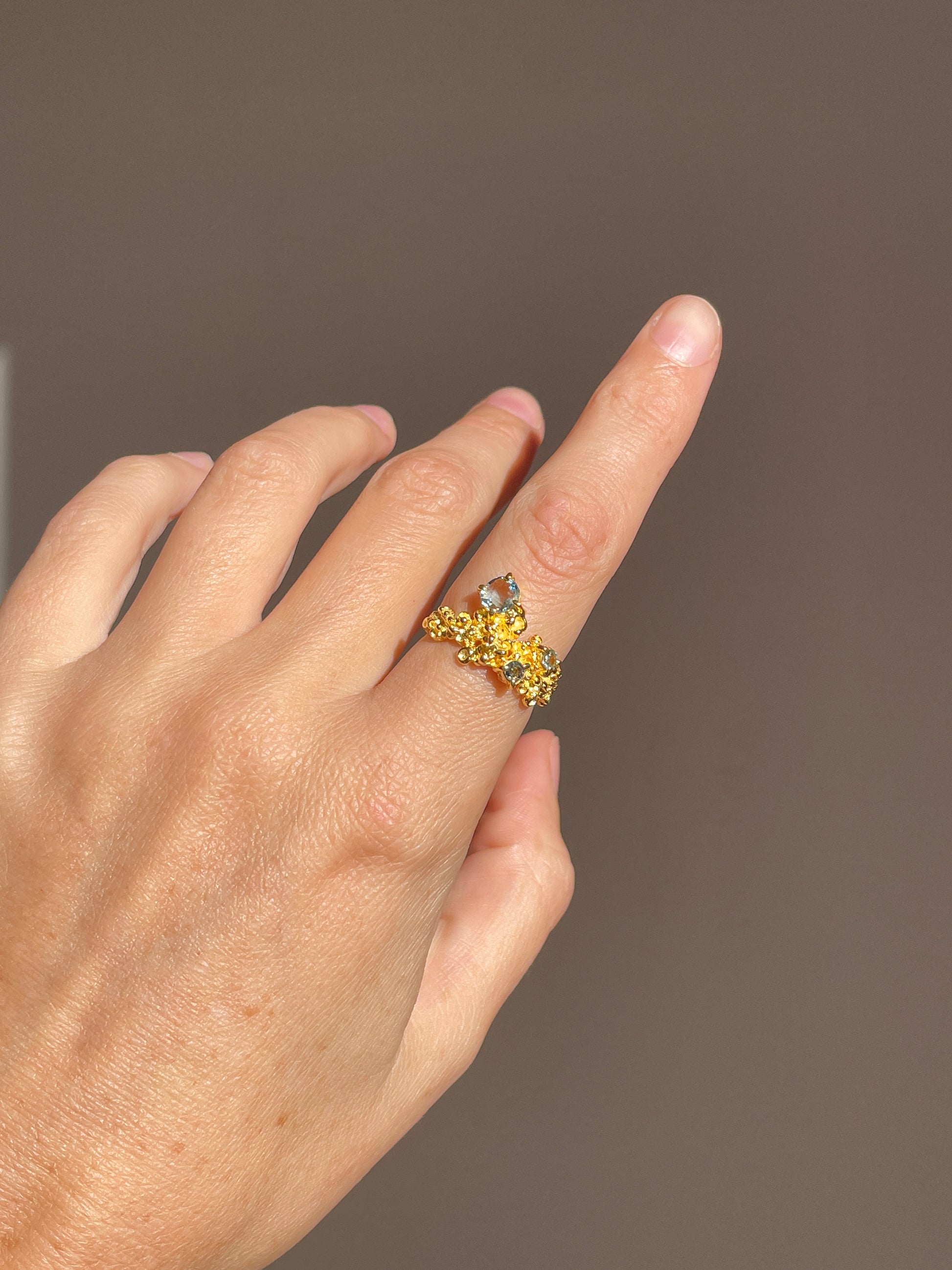 This Coral Ring from Nāmaka is an exquisite piece of jewellery for any special occasion. Crafted with 22 kt Gold and Sterling Silver, it is sure to turn heads with its sparkling aqua and blue sapphires and aquamarine stones. Fall in love with this beautiful and unique ring, perfect to be treasured and admired!