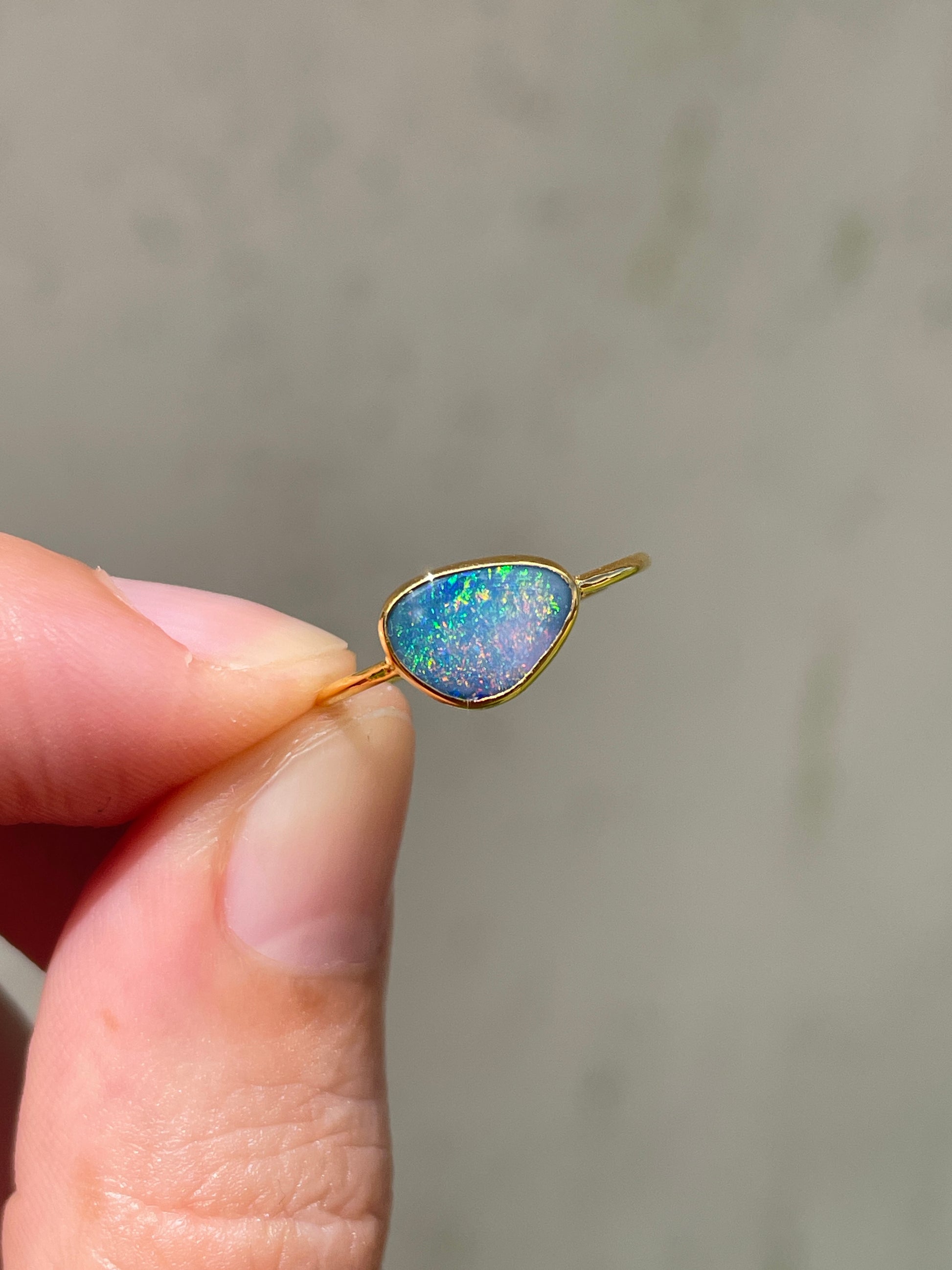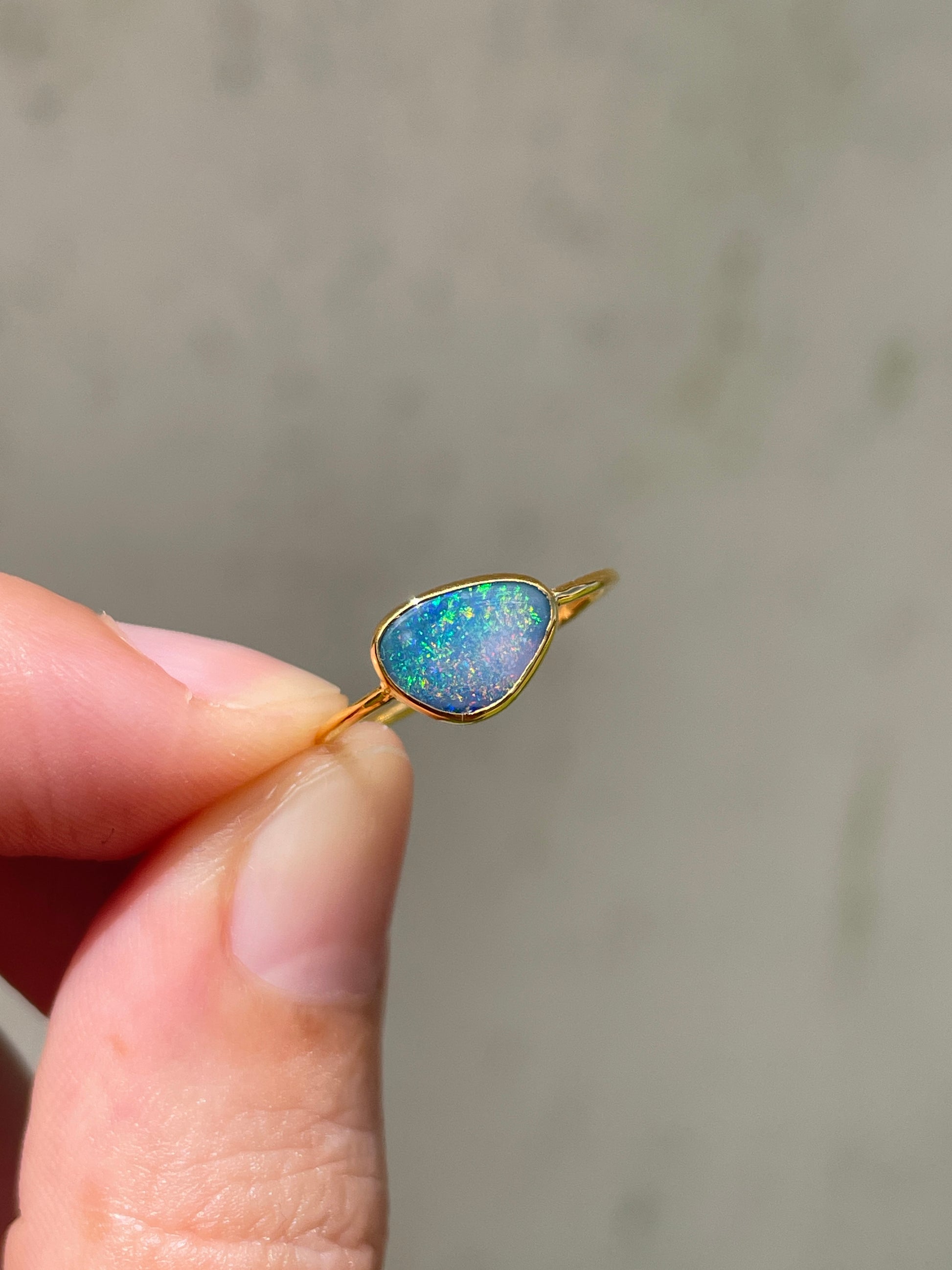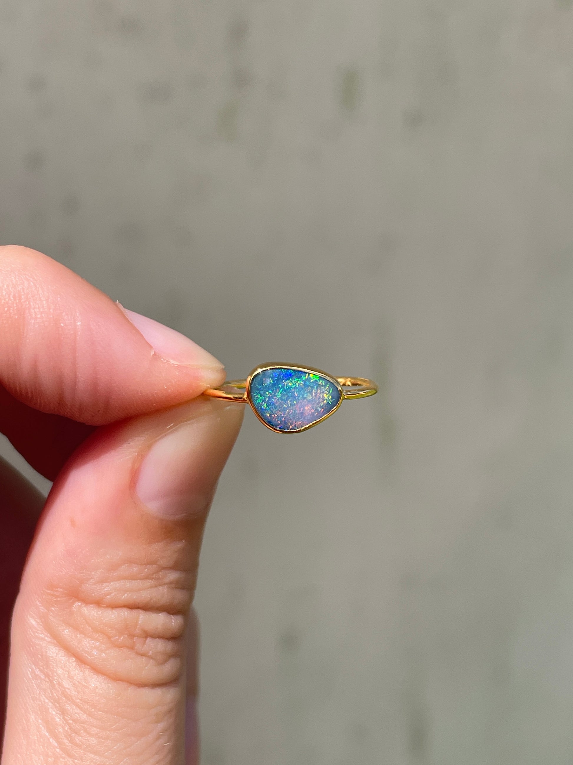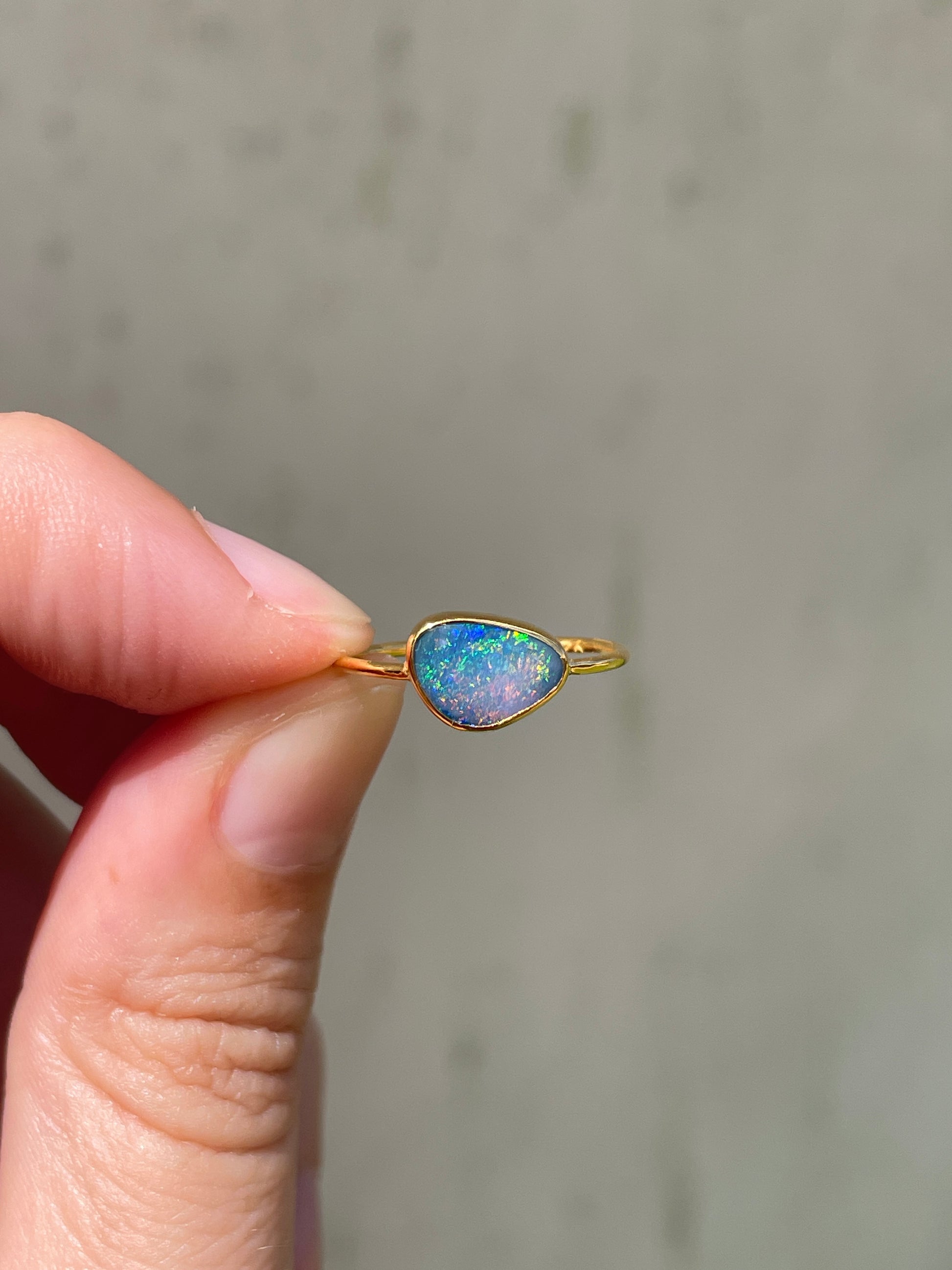 Discover the elegant minimalism of this opal ring by Nāmaka. This ring features a stunning Australian opal stone set in a 22 kt gold plated sterling silver band, adding a touch of sophistication to any outfit. Elevate your style and channel your inner goddess with this beautiful piece. Perfect for stacking, and wearing everyday.