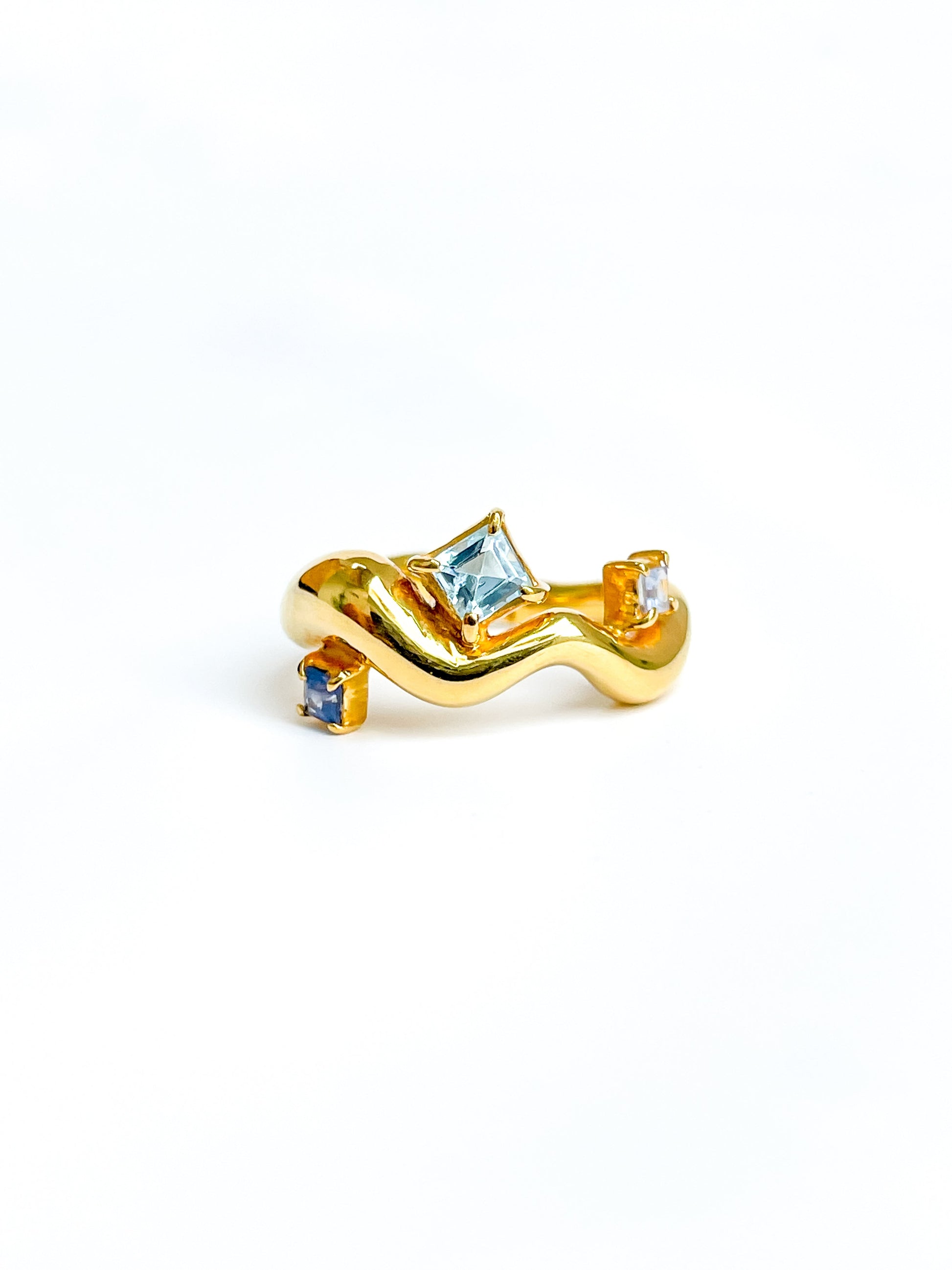 This Wave Ring, in 22K Gold Plated Sterling Silver, complimented by a trinity Square Blue Sapphires and Aquamarines.
