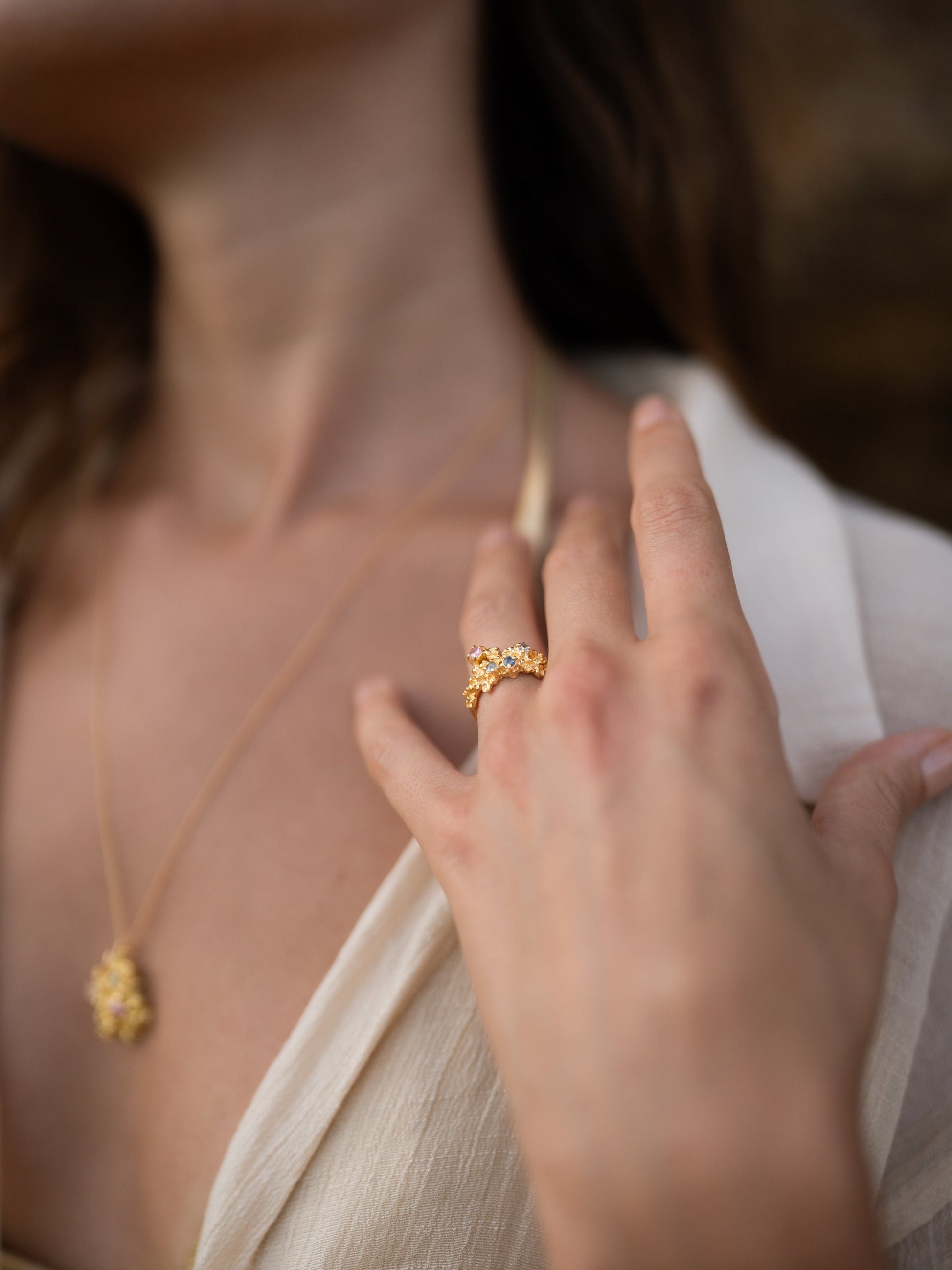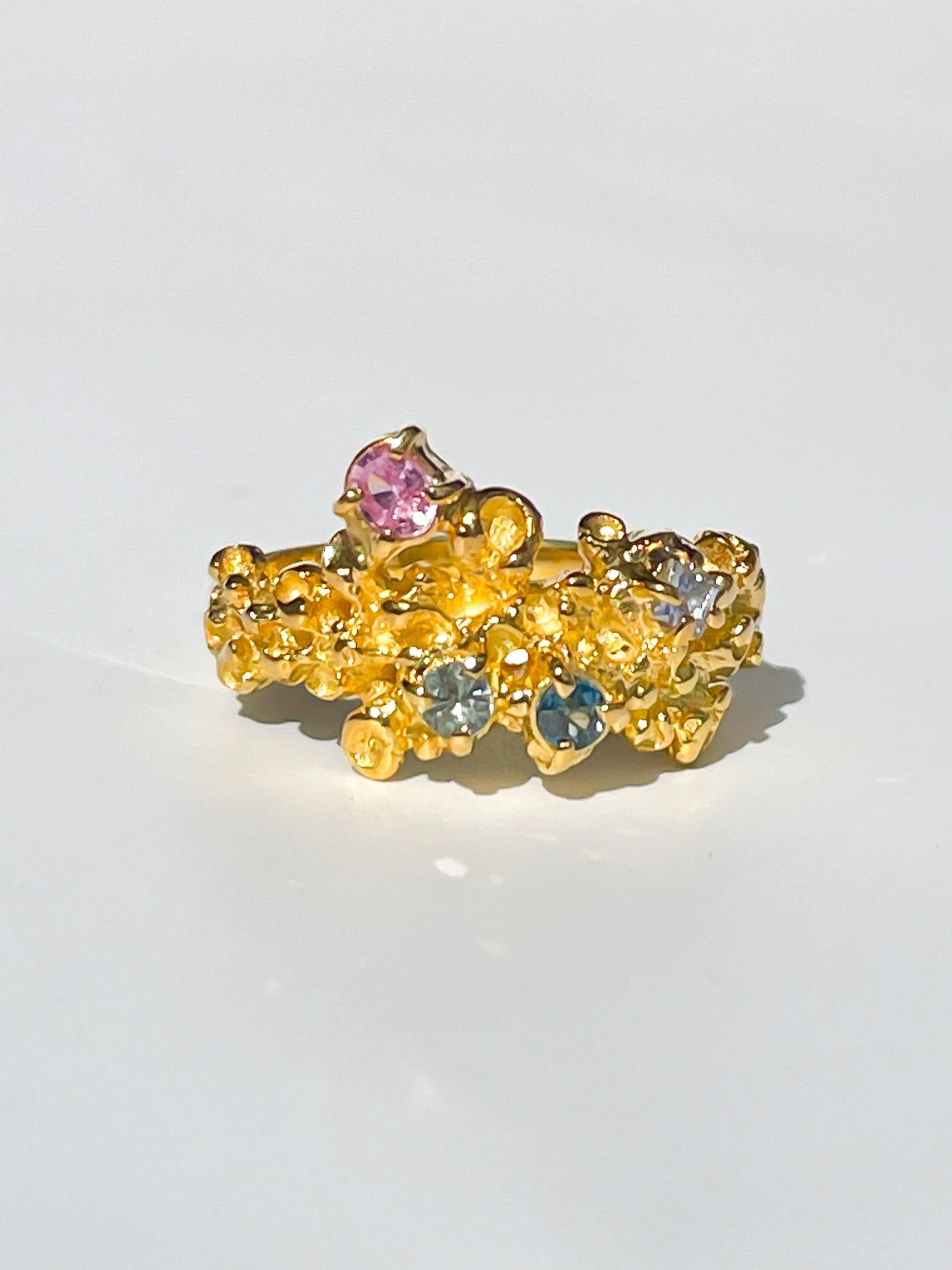 Coral Ring Gold #11 with candy coloured Sapphires - size 6