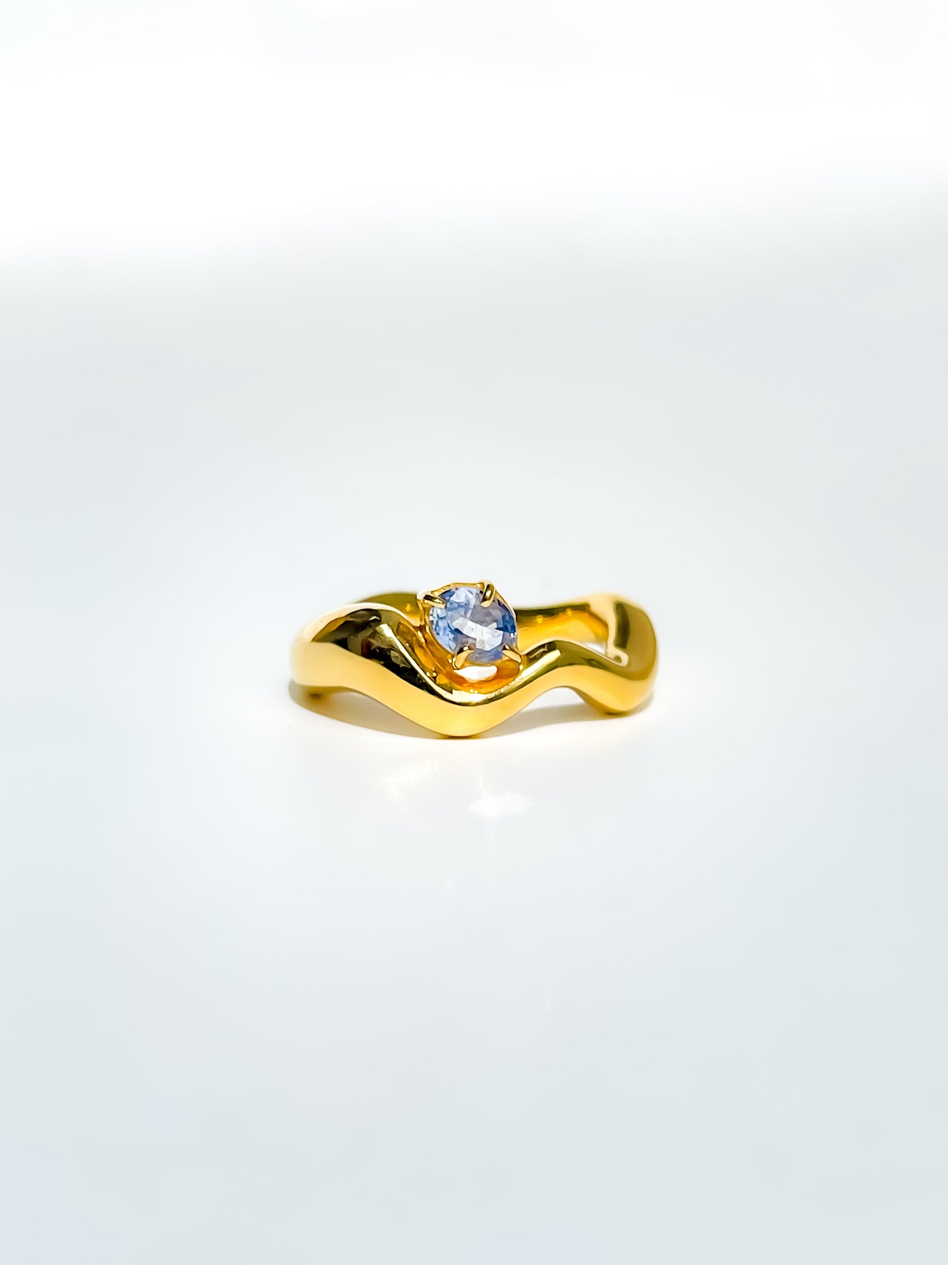 This Wave Ring, in 22K Gold Plated Sterling Silver, complimented by a single Oval Baby Blue & Aqua Sapphire gem.