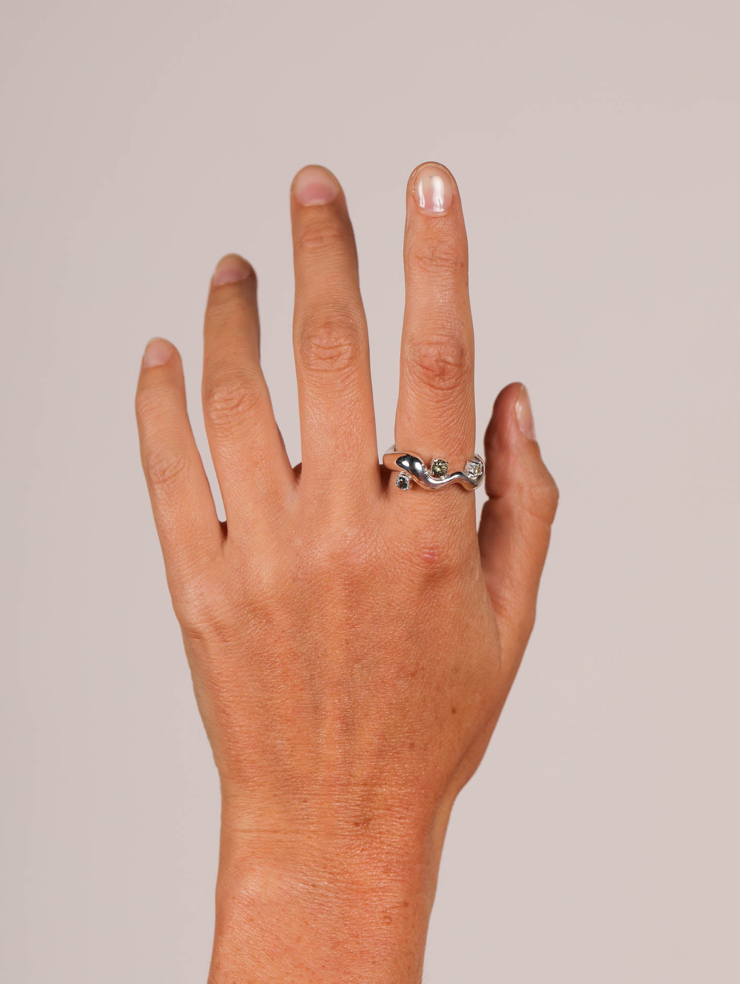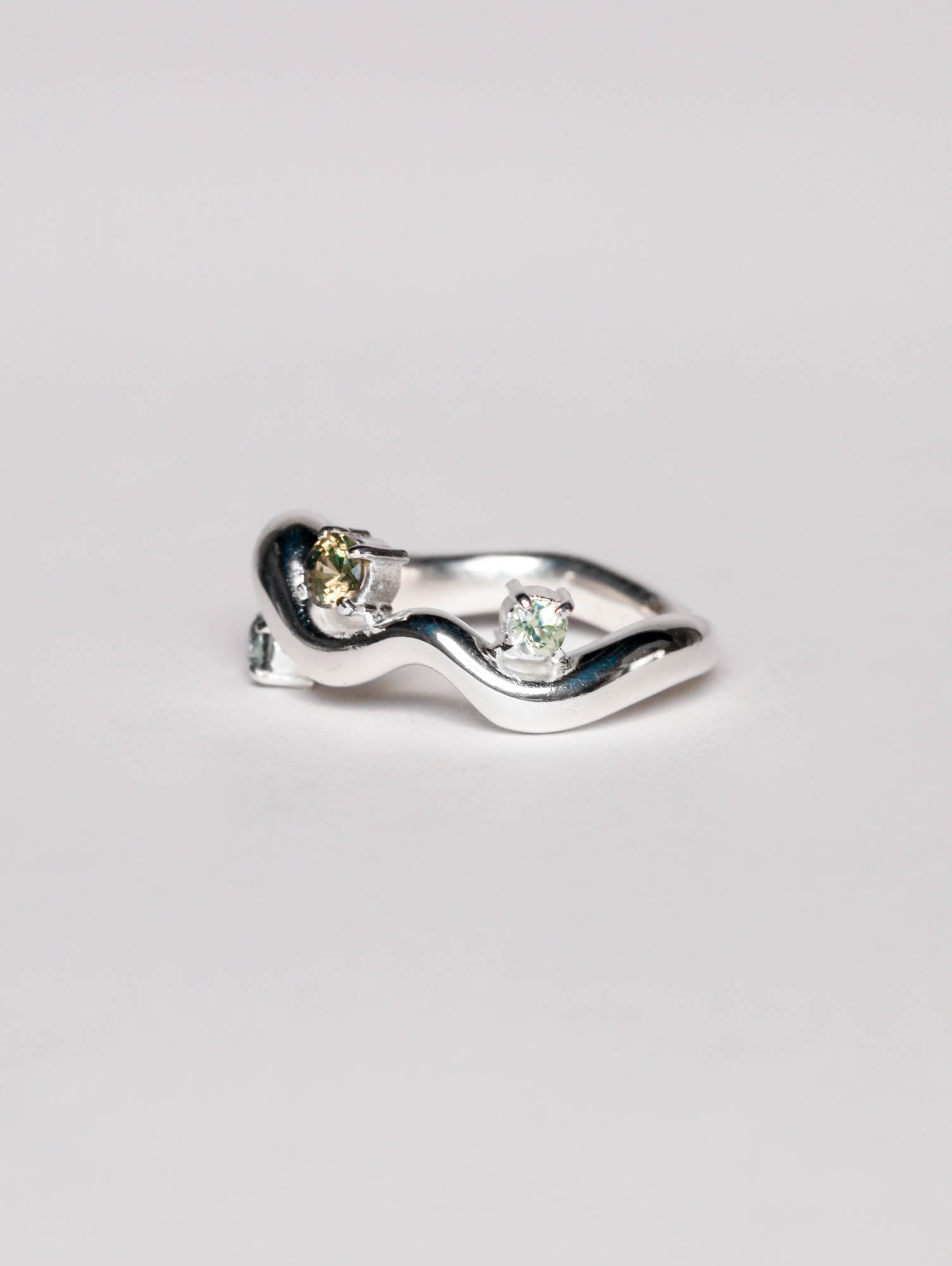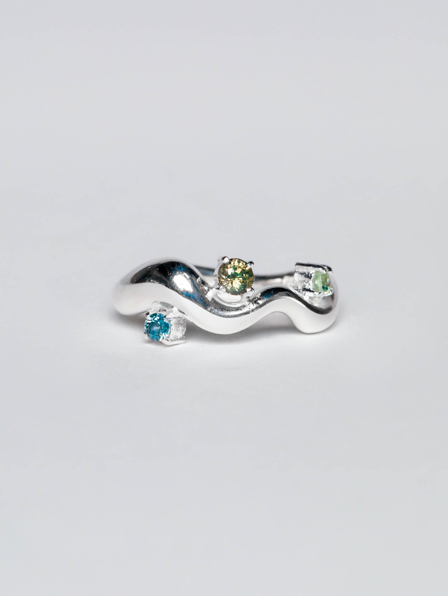 This Wave Ring, in Solid Sterling Silver, complimented by a triplet of brilliant cut Sapphire and Tourmaline gemstones, in bright spectrums of blues and greens.