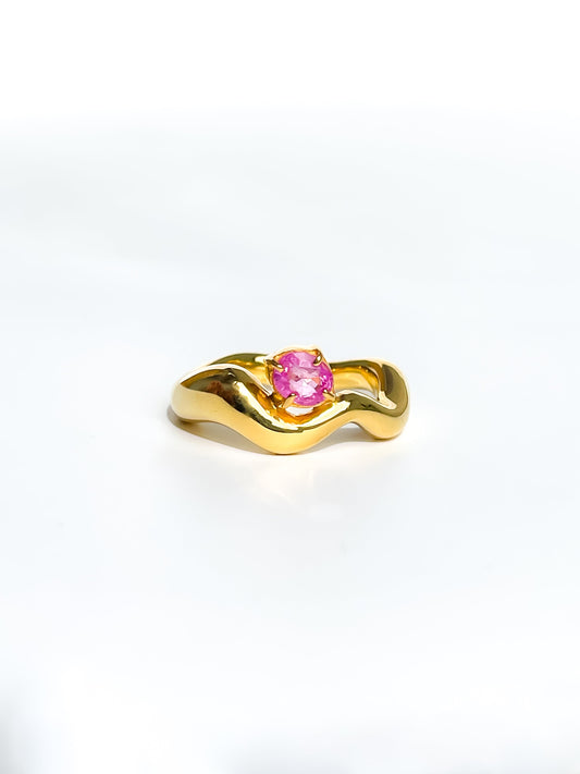 Wave Ring Gold with single Pink Tourmaline # 14 | Size 7